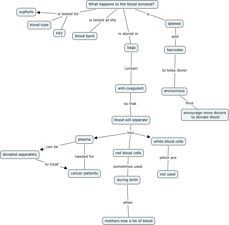 This Concept Map, created with IHMC CmapTools, has information related to: IRENE POST, during birth when mothers lose a lot of blood, What happens to the blood donated? is stored in bags, blood will separate into red blood cells, What happens to the blood donated? is tested for HIV, blood will separate into white blood cells, blood will separate into plasma, white blood cells which are not used, bags contain anti-coagulant, barcodes to keep donor anonymous, What happens to the blood donated? is labeled, red blood cells sometimes used during birth, What happens to the blood donated? is tested at the blood bank, What happens to the blood donated? is tested for blood type, anonymous thus encourage more donors to donate blood, labeled with barcodes, anti-coagulant so that blood will separate, What happens to the blood donated? is tested for syphylis, donated separately to treat cancer patients, plasma needed for cancer patients, plasma can be donated separately