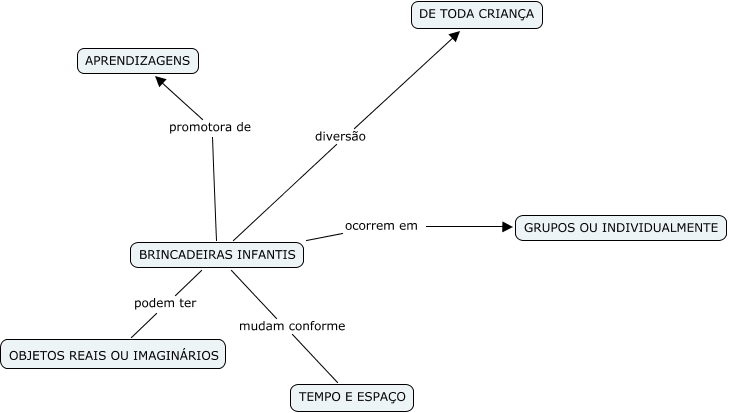 Esse mapa conceitual, produzido no IHMC CmapTools, tem a informação relacionada a: BRINCADEIRAS INFANTIS, BRINCADEIRAS INFANTIS promotora de APRENDIZAGENS, BRINCADEIRAS INFANTIS diversão DE TODA CRIANÇA, BRINCADEIRAS INFANTIS mudam conforme TEMPO E ESPAÇO, BRINCADEIRAS INFANTIS podem ter OBJETOS REAIS OU IMAGINÁRIOS, BRINCADEIRAS INFANTIS ocorrem em GRUPOS OU INDIVIDUALMENTE