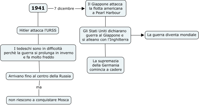 Questa Cmap, creata con IHMC CmapTools, contiene informazioni relative a: 1941, 1941 ???? Hitler attacca l'URSS, Gli Stati Uniti dichiarano guerra al Giappone e si alleano con l'Inghilterra ???? La guerra diventa mondiale, Hitler attacca l'URSS ???? I tedeschi sono in difficoltà perchè la guerra si prolunga in inverno e fa molto freddo, Il Giappone attacca la flotta americana a Pearl Harbour ???? Gli Stati Uniti dichiarano guerra al Giappone e si alleano con l'Inghilterra, Arrivano fino al centro della Russia ma non riescono a conquistare Mosca, 1941 7 dicembre Il Giappone attacca la flotta americana a Pearl Harbour, I tedeschi sono in difficoltà perchè la guerra si prolunga in inverno e fa molto freddo ???? Arrivano fino al centro della Russia, Gli Stati Uniti dichiarano guerra al Giappone e si alleano con l'Inghilterra ???? La supremazia della Germania comincia a cadere