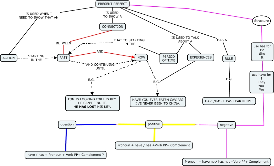 Este Cmap, tiene información relacionada con: PRESENT PERFECT, CONNECTION BETWEEN PAST, question have / has + Pronoun + Verb PP+ Complement ?, EXPERIENCES E.G. HAVE YOU EVER EATEN CAVIAR? I'VE NEVER BEEN TO CHINA., PAST AND CONTINUING UNTIL NOW, NOW E.G. HAVE YOU EVER EATEN CAVIAR? I'VE NEVER BEEN TO CHINA., NOW E.G. TOM IS LOOKING FOR HIS KEY. HE CAN'T FIND IT. HE HAS LOST HIS KEY., RULE E.G. HAVE/HAS + PAST PARTICIPLE, positive ???? Pronoun + have / has +Verb PP+ Complement, ACTION STARTING IN THE PAST, PRESENT PERFECT IS USED TO TALK ABOUT A EXPERIENCES, positive .. question, negative Structure PRESENT PERFECT, negative ... positive, PRESENT PERFECT IS USED WHEN I NEED TO SHOW THAT AN ACTION, PRESENT PERFECT HAS A RULE, PRESENT PERFECT IS USED TO TALK ABOUT A PERIOD OF TIME, PERIOD OF TIME THAT TO STARTING IN THE PAST, PRESENT PERFECT IS USED TO SHOW A CONNECTION, negative Pronoun + have not/ has not +Verb PP+ Complement