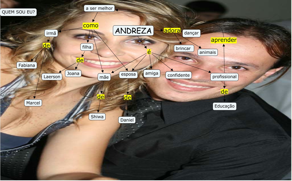 Esse mapa conceitual, produzido no IHMC CmapTools, tem a informação relacionada a: Andreza, a ser melhor como mãe, filha de Joana, ANDREZA adora animais, esposa de Daniel, ANDREZA é amiga, a ser melhor como irmã, irmã de Fabiana, ANDREZA é profissional, profissional aprender a ser melhor, ANDREZA é mãe, ANDREZA adora brincar, ANDREZA adora dançar, ANDREZA é esposa, irmã de Marcel, mãe de Shiwa, a ser melhor como esposa, profissional de Educação, a ser melhor como filha, filha de Laerson, ANDREZA é confidente