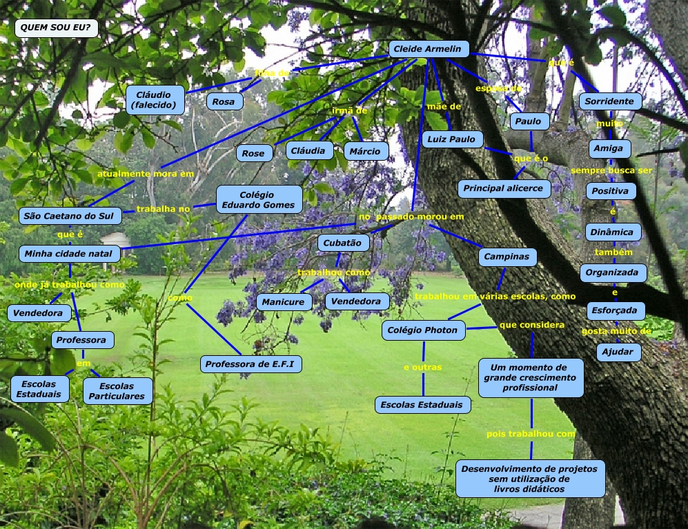 Esse mapa conceitual, produzido no IHMC CmapTools, tem a informação relacionada a: cleide, Colégio Eduardo Gomes como Professora de E.F.I, Cleide Armelin irmã de Márcio, Amiga sempre busca ser Positiva, Esforçada gosta muito de Ajudar, Colégio Photon que considera Um momento de grande crescimento profissional, Colégio Photon e outras Escolas Estaduais, Dinâmica também Organizada, Cubatão trabalhou como Vendedora, Cleide Armelin no passado morou em Minha cidade natal, Cleide Armelin atualmente mora em São Caetano do Sul, Professora em Escolas Estaduais, Positiva é Dinâmica, Luiz Paulo que é o Principal alicerce, Cleide Armelin no passado morou em Cubatão, Cleide Armelin que é Sorridente, Minha cidade natal onde já trabalhou como Professora, Minha cidade natal onde já trabalhou como Vendedora, Cleide Armelin irmã de Cláudia, Professora em Escolas Particulares, Paulo que é o Principal alicerce