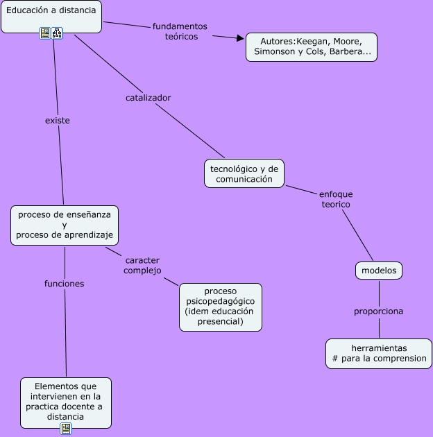 Este Cmap, tiene información relacionada con: educacion a distancia, proceso de enseñanza y proceso de aprendizaje funciones Elementos que intervienen en la practica docente a distancia, Educación a distancia existe proceso de enseñanza y proceso de aprendizaje, Educación a distancia fundamentos teóricos Autores:Keegan, Moore, Simonson y Cols, Barbera..., proceso de enseñanza y proceso de aprendizaje caracter complejo proceso psicopedagógico (idem educación presencial), modelos proporciona herramientas # para la comprension, Educación a distancia catalizador tecnológico y de comunicación, tecnológico y de comunicación enfoque teorico modelos