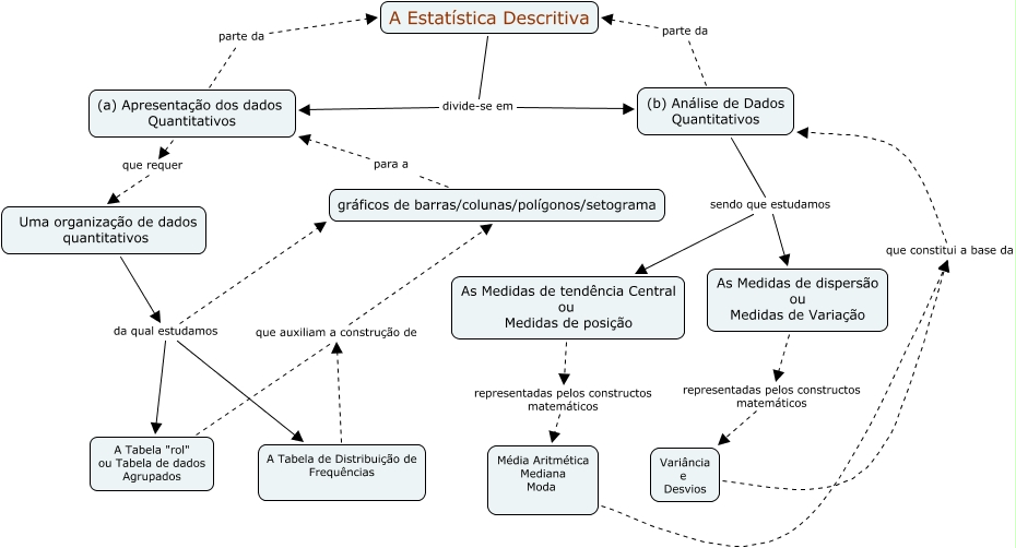 Esse mapa conceitual, produzido no IHMC CmapTools, tem a informação relacionada a: Mapa Estatística descritiva, A Tabela "rol" ou Tabela de dados Agrupados que auxiliam a construção de gráficos de barras/colunas/polígonos/setograma, A Estatística Descritiva divide-se em (b) Análise de Dados Quantitativos, A Estatística Descritiva divide-se em (a) Apresentação dos dados Quantitativos, (a) Apresentação dos dados Quantitativos parte da A Estatística Descritiva, (b) Análise de Dados Quantitativos sendo que estudamos As Medidas de dispersão ou Medidas de Variação, Uma organização de dados quantitativos da qual estudamos gráficos de barras/colunas/polígonos/setograma, Variância e Desvios que constitui a base da (b) Análise de Dados Quantitativos, (a) Apresentação dos dados Quantitativos que requer Uma organização de dados quantitativos, Média Aritmética Mediana Moda que constitui a base da (b) Análise de Dados Quantitativos, Uma organização de dados quantitativos da qual estudamos A Tabela de Distribuição de Frequências, (b) Análise de Dados Quantitativos sendo que estudamos As Medidas de tendência Central ou Medidas de posição, (b) Análise de Dados Quantitativos parte da A Estatística Descritiva, gráficos de barras/colunas/polígonos/setograma para a (a) Apresentação dos dados Quantitativos, Uma organização de dados quantitativos da qual estudamos A Tabela "rol" ou Tabela de dados Agrupados, As Medidas de dispersão ou Medidas de Variação representadas pelos constructos matemáticos Variância e Desvios, As Medidas de tendência Central ou Medidas de posição representadas pelos constructos matemáticos Média Aritmética Mediana Moda, A Tabela de Distribuição de Frequências que auxiliam a construção de gráficos de barras/colunas/polígonos/setograma