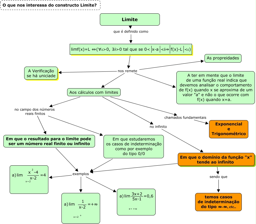 </mtext> </mrow> <none/> </munderover> <mtext> =0,6 </mtext> </mrow> </math>, Limite que é definido como <math xmlns="http://www.w3.org/1998/Math/MathML"> <mrow> <mtext> limf(x)=L ⇔(∀ε≻0, ∃δ≻0 tal que se 0≺ </mtext> <mfenced open="" close="|"> <mtext> </mtext> </mfenced> <mtext> x-a </mtext> <mfenced open="" close="|"> <mtext> </mtext> </mfenced> <mtext> ≺δ⇒ </mtext> <mfenced open="|" close=""> <mtext> f(x)-L </mtext> <mfenced open="" close="|"> <mtext> </mtext> </mfenced> </mfenced> <mtext> ≺ε) </mtext> </mrow> </math>, <math xmlns="http://www.w3.org/1998/Math/MathML"> <mrow> <mtext> limf(x)=L ⇔(∀ε≻0, ∃δ≻0 tal que se 0≺ </mtext> <mfenced open="" close="|"> <mtext> </mtext> </mfenced> <mtext> x-a </mtext> <mfenced open="" close="|"> <mtext> </mtext> </mfenced> <mtext> ≺δ⇒ </mtext> <mfenced open="|" close=""> <mtext> f(x)-L </mtext> <mfenced open="" close="|"> <mtext> </mtext> </mfenced> </mfenced> <mtext> ≺ε) </mtext> </mrow> </math> nos remete A ter em mente que o limite de uma função real indica que devemos analisar o comportamento de f(x) quando x se aproxima de um valor "a" e não o que ocorre com f(x) quando x=a., Aos cálculos com limites no infinito Em que o domínio da função "x" tende ao infinito, Em que o domínio da função "x" tende ao infinito sendo que temos casos de indeterminação do tipo ∞-∞, etc.., Em que o resultado para o limite pode ser um número real finito ou infinito exemplos <math xmlns="http://www.w3.org/1998/Math/MathML"> <mrow> <mtext> a) </mtext> <munderover> <mrow> <mtext> lim </mtext> <mfrac> <mrow> <mmultiscripts> <mtext> </mtext> <none/> <mtext> </mtext> </mmultiscripts> <mtext> 1 </mtext> </mrow> <mtext> x-2 </mtext> </mfrac> <mtext>