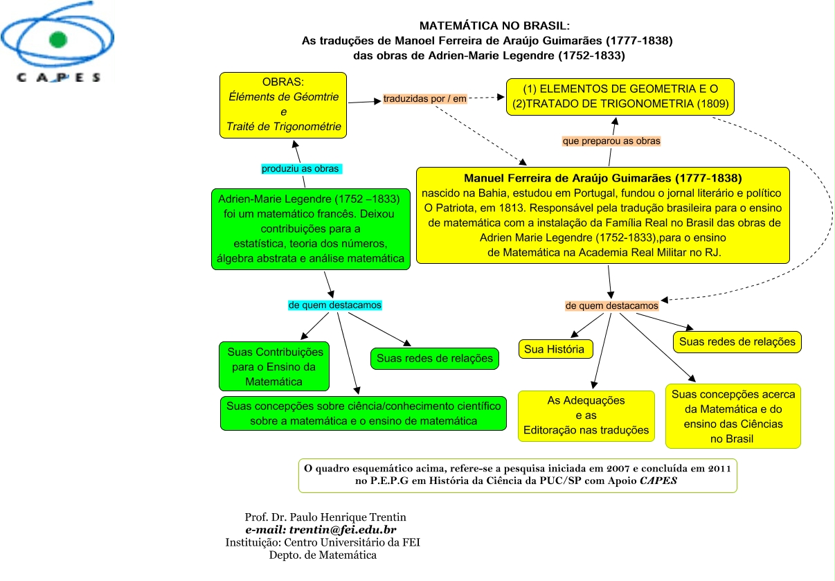 This Concept Map, created with IHMC CmapTools, has information related to: A tese da doutoramento, Manuel Ferreira de Araújo Guimarães (1777-1838) nascido na Bahia, estudou em Portugal, fundou o jornal literário e político O Patriota, em 1813. Responsável pela tradução brasileira para o ensino de matemática com a instalação da Família Real no Brasil das obras de Adrien Marie Legendre (1752-1833),para o ensino de Matemática na Academia Real Militar no RJ. de quem destacamos Sua História, Adrien-Marie Legendre (1752 –1833) foi um matemático francês. Deixou contribuições para a estatística, teoria dos números, álgebra abstrata e análise matemática de quem destacamos Suas redes de relações, OBRAS: Éléments de Géomtrie e Traité de Trigonométrie traduzidas por / em (1) ELEMENTOS DE GEOMETRIA E O (2)TRATADO DE TRIGONOMETRIA (1809), (1) ELEMENTOS DE GEOMETRIA E O (2)TRATADO DE TRIGONOMETRIA (1809) de quem destacamos Sua História, Manuel Ferreira de Araújo Guimarães (1777-1838) nascido na Bahia, estudou em Portugal, fundou o jornal literário e político O Patriota, em 1813. Responsável pela tradução brasileira para o ensino de matemática com a instalação da Família Real no Brasil das obras de Adrien Marie Legendre (1752-1833),para o ensino de Matemática na Academia Real Militar no RJ. que preparou as obras (1) ELEMENTOS DE GEOMETRIA E O (2)TRATADO DE TRIGONOMETRIA (1809), Manuel Ferreira de Araújo Guimarães (1777-1838) nascido na Bahia, estudou em Portugal, fundou o jornal literário e político O Patriota, em 1813. Responsável pela tradução brasileira para o ensino de matemática com a instalação da Família Real no Brasil das obras de Adrien Marie Legendre (1752-1833),para o ensino de Matemática na Academia Real Militar no RJ. de quem destacamos As Adequações e as Editoração nas traduções, Manuel Ferreira de Araújo Guimarães (1777-1838) nascido na Bahia, estudou em Portugal, fundou o jornal literário e político O Patriota, em 1813. Responsável pela tradução brasileira para o ensino de matemática com a instalação da Família Real no Brasil das obras de Adrien Marie Legendre (1752-1833),para o ensino de Matemática na Academia Real Militar no RJ. de quem destacamos Suas concepções acerca da Matemática e do ensino das Ciências no Brasil, Manuel Ferreira de Araújo Guimarães (1777-1838) nascido na Bahia, estudou em Portugal, fundou o jornal literário e político O Patriota, em 1813. Responsável pela tradução brasileira para o ensino de matemática com a instalação da Família Real no Brasil das obras de Adrien Marie Legendre (1752-1833),para o ensino de Matemática na Academia Real Militar no RJ. de quem destacamos Suas redes de relações, Adrien-Marie Legendre (1752 –1833) foi um matemático francês. Deixou contribuições para a estatística, teoria dos números, álgebra abstrata e análise matemática de quem destacamos Suas Contribuições para o Ensino da Matemática, OBRAS: Éléments de Géomtrie e Traité de Trigonométrie traduzidas por / em Manuel Ferreira de Araújo Guimarães (1777-1838) nascido na Bahia, estudou em Portugal, fundou o jornal literário e político O Patriota, em 1813. Responsável pela tradução brasileira para o ensino de matemática com a instalação da Família Real no Brasil das obras de Adrien Marie Legendre (1752-1833),para o ensino de Matemática na Academia Real Militar no RJ., (1) ELEMENTOS DE GEOMETRIA E O (2)TRATADO DE TRIGONOMETRIA (1809) de quem destacamos Suas concepções acerca da Matemática e do ensino das Ciências no Brasil, Adrien-Marie Legendre (1752 –1833) foi um matemático francês. Deixou contribuições para a estatística, teoria dos números, álgebra abstrata e análise matemática produziu as obras OBRAS: Éléments de Géomtrie e Traité de Trigonométrie, Adrien-Marie Legendre (1752 –1833) foi um matemático francês. Deixou contribuições para a estatística, teoria dos números, álgebra abstrata e análise matemática de quem destacamos Suas concepções sobre ciência/conhecimento científico sobre a matemática e o ensino de matemática, (1) ELEMENTOS DE GEOMETRIA E O (2)TRATADO DE TRIGONOMETRIA (1809) de quem destacamos As Adequações e as Editoração nas traduções, (1) ELEMENTOS DE GEOMETRIA E O (2)TRATADO DE TRIGONOMETRIA (1809) de quem destacamos Suas redes de relações