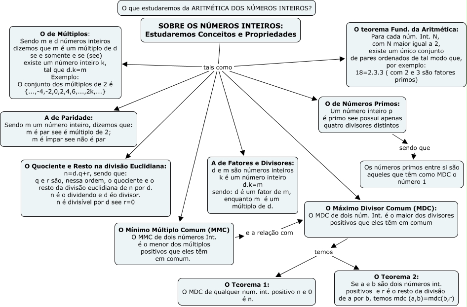 Esse mapa conceitual, produzido no IHMC CmapTools, tem a informação relacionada a: Aritmética do números inteiros, O de Números Primos: Um número inteiro p é primo see possui apenas quatro divisores distintos sendo que Os números primos entre si são aqueles que têm como MDC o número 1, O Máximo Divisor Comum (MDC): O MDC de dois núm. Int. é o maior dos divisores positivos que eles têm em comum temos O Teorema 2: Se a e b são dois números int. positivos e r é o resto da divisão de a por b, temos mdc (a,b)=mdc(b,r), SOBRE OS NÚMEROS INTEIROS: Estudaremos Conceitos e Propriedades tais como O Mínimo Múltiplo Comum (MMC) O MMC de dois números Int. é o menor dos múltiplos positivos que eles têm em comum., SOBRE OS NÚMEROS INTEIROS: Estudaremos Conceitos e Propriedades tais como O teorema Fund. da Aritmética: Para cada núm. Int. N, com N maior igual a 2, existe um único conjunto de pares ordenados de tal modo que, por exemplo: 18=2.3.3 ( com 2 e 3 são fatores primos), SOBRE OS NÚMEROS INTEIROS: Estudaremos Conceitos e Propriedades tais como A de Paridade: Sendo m um número inteiro, dizemos que: m é par see é múltiplo de 2; m é ímpar see não é par, SOBRE OS NÚMEROS INTEIROS: Estudaremos Conceitos e Propriedades tais como A de Fatores e Divisores: d e m são números inteiros k é um número inteiro d.k=m sendo: d é um fator de m, enquanto m é um múltiplo de d., SOBRE OS NÚMEROS INTEIROS: Estudaremos Conceitos e Propriedades tais como O Máximo Divisor Comum (MDC): O MDC de dois núm. Int. é o maior dos divisores positivos que eles têm em comum, SOBRE OS NÚMEROS INTEIROS: Estudaremos Conceitos e Propriedades tais como O Quociente e Resto na divisão Euclidiana: n=d.q+r, sendo que: q e r são, nessa ordem, o quociente e o resto da divisão euclidiana de n por d. n é o dividendo e d éo divisor. n é divisível por d see r=0, SOBRE OS NÚMEROS INTEIROS: Estudaremos Conceitos e Propriedades tais como O de Múltiplos: Sendo m e d números inteiros dizemos que m é um múltiplo de d se e somente e se (see) existe um número inteiro k, tal que d.k=m Exemplo: O conjunto dos múltiplos de 2 é {...,-4,-2,0,2,4,6,...,2k,...}, SOBRE OS NÚMEROS INTEIROS: Estudaremos Conceitos e Propriedades tais como O de Números Primos: Um número inteiro p é primo see possui apenas quatro divisores distintos, O Máximo Divisor Comum (MDC): O MDC de dois núm. Int. é o maior dos divisores positivos que eles têm em comum temos O Teorema 1: O MDC de qualquer num. int. positivo n e 0 é n., O Mínimo Múltiplo Comum (MMC) O MMC de dois números Int. é o menor dos múltiplos positivos que eles têm em comum. e a relação com O Máximo Divisor Comum (MDC): O MDC de dois núm. Int. é o maior dos divisores positivos que eles têm em comum