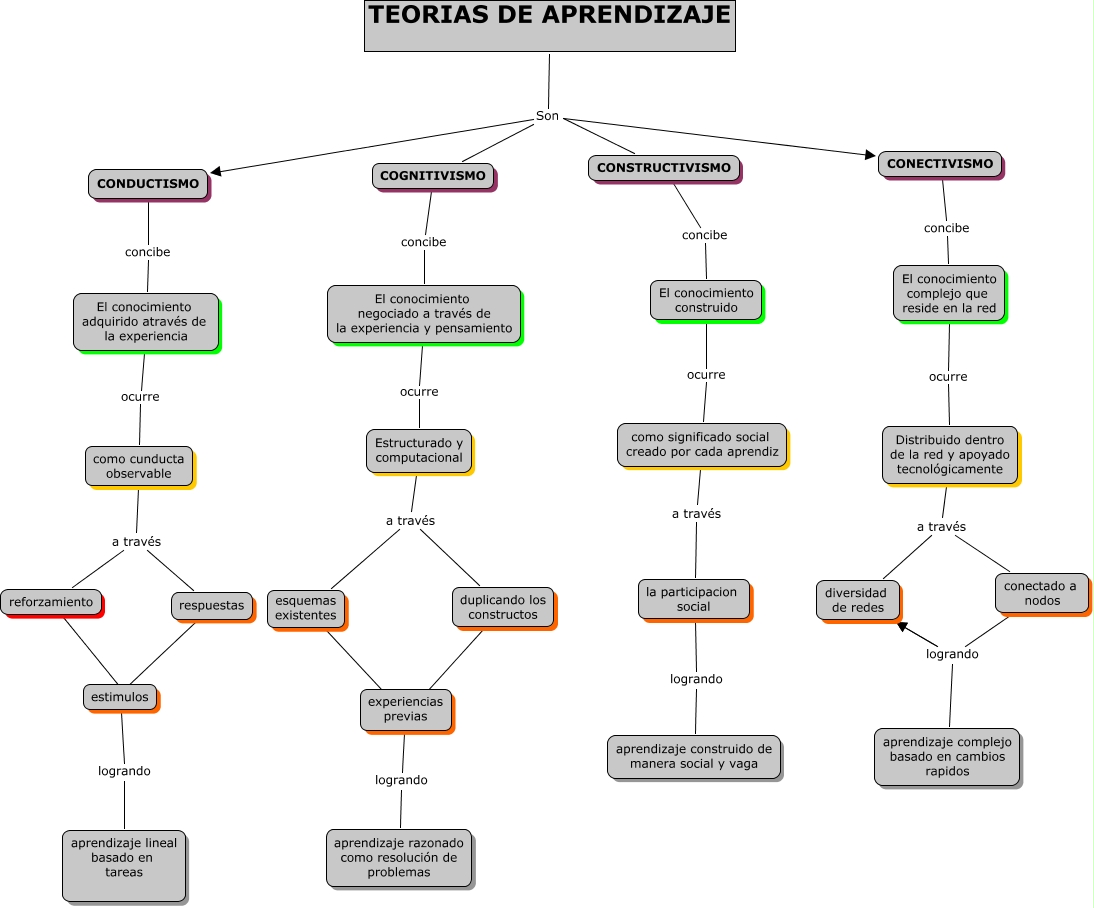 Este Cmap, tiene información relacionada con: TEORIAS DE APRENDIZAJE, la participacion social logrando aprendizaje construido de manera social y vaga, Estructurado y computacional a través duplicando los constructos, CONSTRUCTIVISMO concibe El conocimiento construido, como cunducta observable a través respuestas, como cunducta observable a través reforzamiento, El conocimiento complejo que reside en la red ocurre Distribuido dentro de la red y apoyado tecnológicamente, CONECTIVISMO concibe El conocimiento complejo que reside en la red, COGNITIVISMO concibe El conocimiento negociado a través de la experiencia y pensamiento, TEORIAS DE APRENDIZAJE Son CONDUCTISMO, conectado a nodos logrando aprendizaje complejo basado en cambios rapidos, respuestas ???? estimulos, experiencias previas logrando aprendizaje razonado como resolución de problemas, conectado a nodos logrando diversidad de redes, esquemas existentes ???? experiencias previas, CONDUCTISMO concibe El conocimiento adquirido através de la experiencia, El conocimiento construido ocurre como significado social creado por cada aprendiz, TEORIAS DE APRENDIZAJE Son CONSTRUCTIVISMO, TEORIAS DE APRENDIZAJE Son COGNITIVISMO, TEORIAS DE APRENDIZAJE Son CONECTIVISMO, Estructurado y computacional a través esquemas existentes