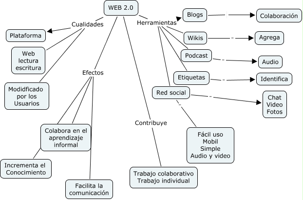Este Cmap, tiene información relacionada con: WEB 2.0, WEB 2.0 Herramientas Podcast, Etiquetas . Identifica, WEB 2.0 Efectos Incrementa el Conocimiento, WEB 2.0 Efectos Facilita la comunicación, WEB 2.0 Herramientas Wikis, Wikis . Agrega, WEB 2.0 Herramientas Blogs, WEB 2.0 Contribuye Trabajo colaborativo Trabajo individual, Red social . Fácil uso Mobil Simple Audio y video, WEB 2.0 Cualidades Plataforma, Blogs Colaboración, Red social . Chat Video Fotos, WEB 2.0 Cualidades Modidficado por los Usuarios, WEB 2.0 Efectos Colabora en el aprendizaje informal, WEB 2.0 Herramientas Red social, WEB 2.0 Cualidades Web lectura escritura, WEB 2.0 Herramientas Etiquetas, Podcast . Audio