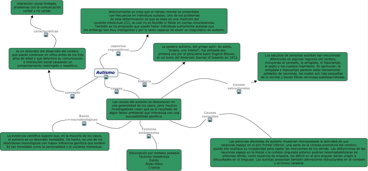 Este Cmap, tiene información relacionada con: autismo, Autismo causas Las causas del autismo se desconocen en una generalidad de los casos, pero muchos investigadores creen que es el resultado de algún factor ambiental que interactúa con una susceptibilidad genética., Las causas del autismo se desconocen en una generalidad de los casos, pero muchos investigadores creen que es el resultado de algún factor ambiental que interactúa con una susceptibilidad genética. Causas estructurales Los estudios de personas autistas han encontrado diferencias en algunas regiones del cerebro, incluyendo el cerebelo, la amígdala, el hipocampo, el septo y los cuerpos mamilares. En particular, la amígdala e hipocampo parecen estar densamente poblados de neuronas, las cuales son más pequeñas de lo normal y tienen fibras nerviosas subdesarrolladas., Las causas del autismo se desconocen en una generalidad de los casos, pero muchos investigadores creen que es el resultado de algún factor ambiental que interactúa con una susceptibilidad genética. Causas conocidas Las personas afectadas de autismo muestran menoscabada la actividad de sus neuronas espejo en el giro frontal inferior, una parte de la corteza premotora del cerebro; quizás ello explique su incapacidad para captar las intenciones de los demás. Las disfunciones de las neuronas espejo en la ínsula y la corteza cingulada anterior podrían resoinsababilizarse de síntomas afines, como ausencia de empatía, los déficit en el giro angular darían origen a difucultades en el lenguaje. Los autistas presentan también alteraciones estructurales en el cerebelo y el tronco cerebral., Autismo concepto es un desorden del desarrollo del cerebro que puede comenzar en niños antes de los tres años de edad y que deteriora su comunicación e interacción social causando un comportamiento restringido y repetitivo., es un desorden del desarrollo del cerebro que puede comenzar en niños antes de los tres años de edad y que deteriora su comunicación e interacción social causando un comportamiento restringido y repetitivo. caracteristicas interacción social limitada, problemas con la comunicación verbal y no verbal., Las causas del autismo se desconocen en una generalidad de los casos, pero muchos investigadores creen que es el resultado de algún factor ambiental que interactúa con una susceptibilidad genética. Factores ambientales Intoxicación por metales pesados Factores obstétricos Estrés Ácido fólico Crianza, Autismo aspectos cognositivos Anteriormente se creía que el retraso mental se presentaba con frecuencia en individuos autistas. Uno de los problemas de esta determinación es que se basa en una medición del cociente intelectual (CI), la cual no es factible ni fiable en ciertas circunstancias. También se ha propuesto que puede haber individuos sumamente autistas que sin embargo son muy inteligentes y por lo tanto capaces de eludir un diagnóstico de autismo., Autismo historia La palabra autismo, del griego auto- de autós, "propio, uno mismo", fue utilizada por primera vez por el psiquiatra suizo Eugene Bleuler, en un tomo del American Journal of Insanity en 1912., Las causas del autismo se desconocen en una generalidad de los casos, pero muchos investigadores creen que es el resultado de algún factor ambiental que interactúa con una susceptibilidad genética. Bases neurobiológicas La evidencia científica sugiere que, en la mayoría de los casos, el autismo es un desorden heredable. De hecho, es uno de los desórdenes neurológicos con mayor influencia genética que existen. Es tan heredable como la personalidad o el cociente intelectual.