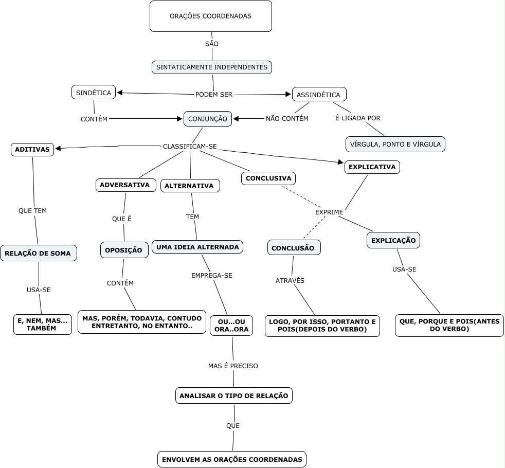 Esse mapa conceitual, produzido no IHMC CmapTools, tem a informação relacionada a: ORAÇÕES COORDENADAS, SINTATICAMENTE INDEPENDENTES PODEM SER SINDÉTICA, ADITIVAS QUE TEM RELAÇÃO DE SOMA, CONJUNÇÃO CLASSIFICAM-SE ADITIVAS, SINTATICAMENTE INDEPENDENTES PODEM SER ASSINDÉTICA, ASSINDÉTICA NÃO CONTÉM CONJUNÇÃO, ORAÇÕES COORDENADAS SÃO SINTATICAMENTE INDEPENDENTES, CONJUNÇÃO CLASSIFICAM-SE EXPLICATIVA, CONJUNÇÃO CLASSIFICAM-SE CONCLUSIVA, OU...OU ORA..ORA MAS É PRECISO ANALISAR O TIPO DE RELAÇÃO, RELAÇÃO DE SOMA USA-SE E, NEM, MAS... TAMBÉM, ASSINDÉTICA É LIGADA POR VÍRGULA, PONTO E VÍRGULA, EXPLICATIVA EXPRIME CONCLUSÃO, ALTERNATIVA TEM UMA IDEIA ALTERNADA, CONJUNÇÃO CLASSIFICAM-SE ALTERNATIVA, ADVERSATIVA QUE É OPOSIÇÃO, CONCLUSIVA EXPRIME EXPLICAÇÃO, CONCLUSIVA EXPRIME CONCLUSÃO, CONJUNÇÃO CLASSIFICAM-SE ADVERSATIVA, EXPLICATIVA EXPRIME EXPLICAÇÃO, OPOSIÇÃO CONTÉM MAS, PORÉM, TODAVIA, CONTUDO ENTRETANTO, NO ENTANTO..