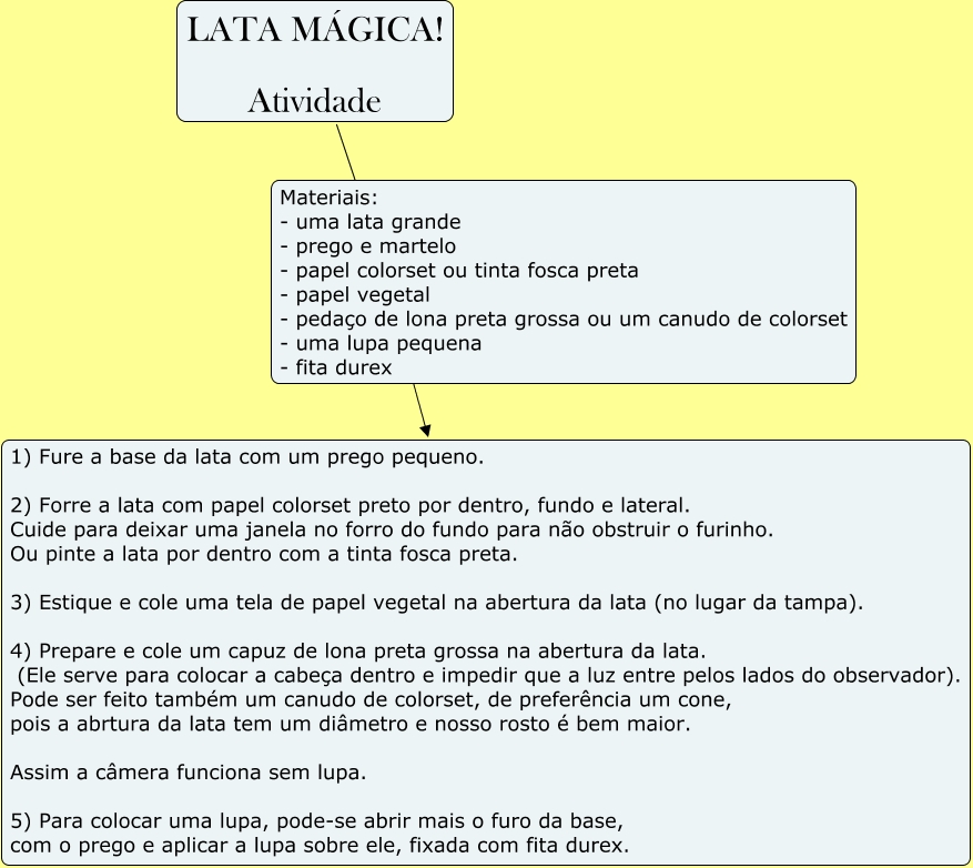 Esse mapa conceitual, produzido no IHMC CmapTools, tem a informação relacionada a: lata mágica, LATA MÁGICA! Atividade 1) Fure a base da lata com um prego pequeno. 2) Forre a lata com papel colorset preto por dentro, fundo e lateral. Cuide para deixar uma janela no forro do fundo para não obstruir o furinho. Ou pinte a lata por dentro com a tinta fosca preta. 3) Estique e cole uma tela de papel vegetal na abertura da lata (no lugar da tampa). 4) Prepare e cole um capuz de lona preta grossa na abertura da lata. (Ele serve para colocar a cabeça dentro e impedir que a luz entre pelos lados do observador). Pode ser feito também um canudo de colorset, de preferência um cone, pois a abrtura da lata tem um diâmetro e nosso rosto é bem maior. Assim a câmera funciona sem lupa. 5) Para colocar uma lupa, pode-se abrir mais o furo da base, com o prego e aplicar a lupa sobre ele, fixada com fita durex.