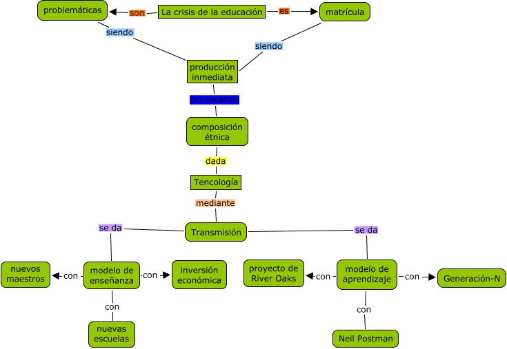 Este Cmap, tiene información relacionada con: MAPA 2 NTPA, modelo de aprendizaje con Neil Postman, Tencología mediante Transmisión, La crisis de la educación son problemáticas, composición étnica dada Tencología, modelo de aprendizaje con proyecto de River Oaks, modelo de enseñanza con nuevas escuelas, modelo de aprendizaje con Generación-N, Transmisión se da modelo de enseñanza, modelo de enseñanza con inversión económica, La crisis de la educación es matrícula, Transmisión se da modelo de aprendizaje, matrícula siendo producción inmediata, modelo de enseñanza con nuevos maestros, producción inmediata provocando composición étnica, problemáticas siendo producción inmediata