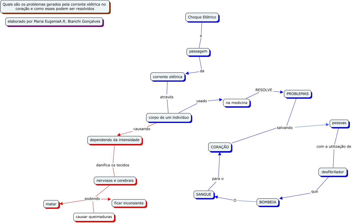 Esse mapa conceitual, produzido no IHMC CmapTools, tem a informação relacionada a: CHOQUE ELÉTRICO MARIA EUGENIA, nervosos e cerebrais podendo ficar inconsiente, nervosos e cerebrais podendo matar, Choque Elétrico é passagem, corpo de um indivíduo causando dependendo da intensidade, PROBLEMAS salvando pessoas, nervosos e cerebrais podendo causar queimaduras, pessoas com a utilização de desfibrilador, CORAÇÃO salvando pessoas, corpo de um indivíduo usado na medicina, corrente elétrica através corpo de um indivíduo, passagem da corrente elétrica, SANGUE para o CORAÇÃO, na medicina RESOLVE PROBLEMAS, BOMBEIA O SANGUE, desfibrilador que BOMBEIA, dependendo da intensidade danifica os tecidos nervosos e cerebrais