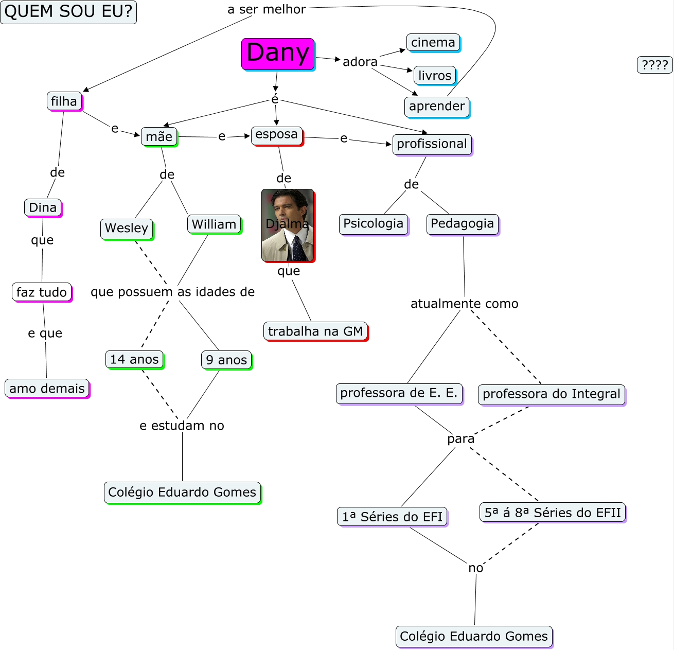 Esse mapa conceitual, produzido no IHMC CmapTools, tem a informação relacionada a: Quem é Dani, Dany é esposa, Wesley que possuem as idades de 9 anos, Dany adora cinema, esposa e profissional, esposa de Djalma, filha e mãe, Dany adora livros, Wesley que possuem as idades de 14 anos, mãe e esposa, Pedagogia atualmente como professora do Integral, professora de E. E. para 1ª Séries do EFI, 1ª Séries do EFI no Colégio Eduardo Gomes, 9 anos e estudam no Colégio Eduardo Gomes, professora de E. E. para 5ª á 8ª Séries do EFII, faz tudo e que amo demais, Pedagogia atualmente como professora de E. E., William que possuem as idades de 14 anos, mãe de Wesley, 5ª á 8ª Séries do EFII no Colégio Eduardo Gomes, filha de Dina