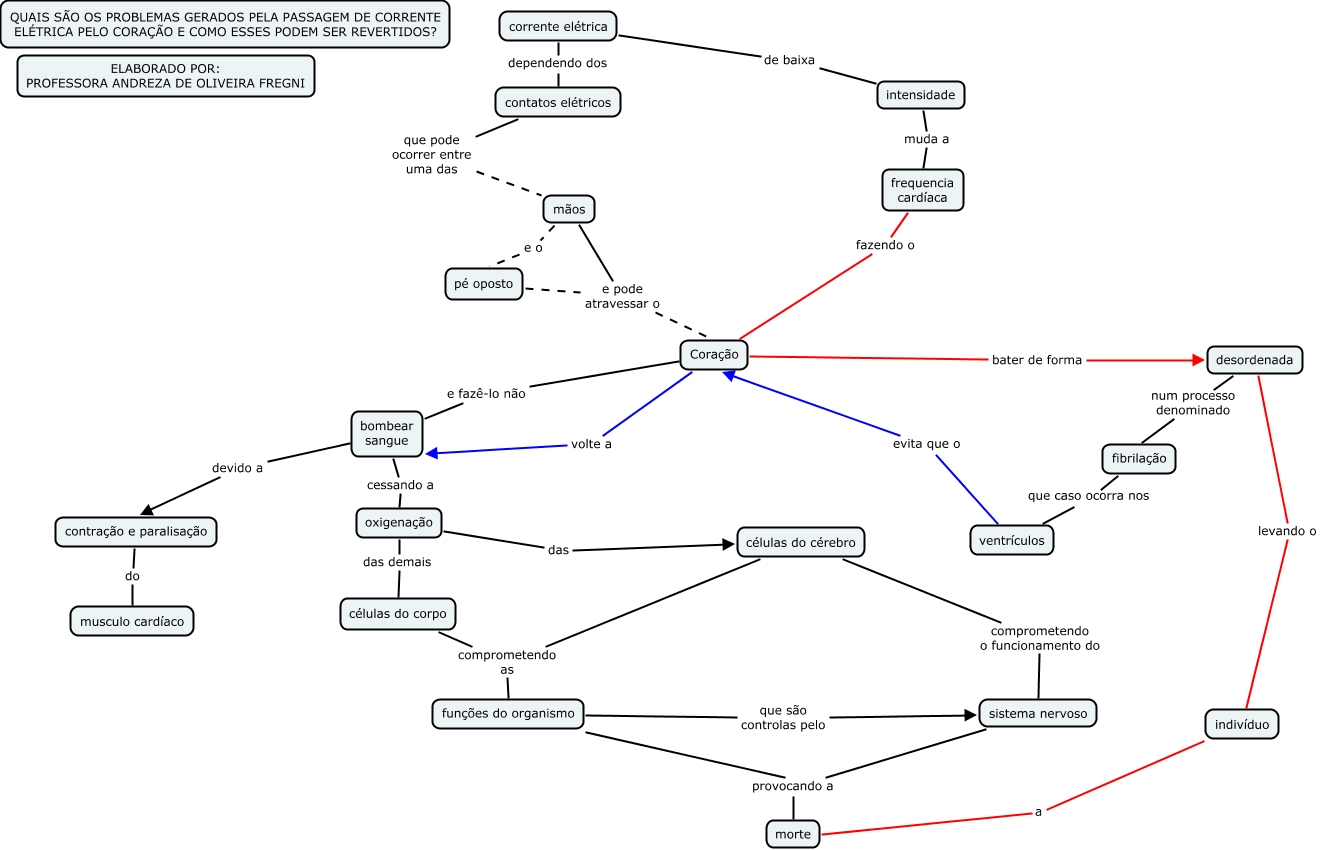 Esse mapa conceitual, produzido no IHMC CmapTools, tem a informação relacionada a: Corrente elétrica, mãos e o pé oposto, bombear sangue devido a contração e paralisação, Coração e fazê-lo não bombear sangue, corrente elétrica dependendo dos contatos elétricos, funções do organismo que são controlas pelo sistema nervoso, bombear sangue cessando a oxigenação, células do cérebro comprometendo o funcionamento do sistema nervoso, oxigenação das células do cérebro, contatos elétricos que pode ocorrer entre uma das mãos, Coração bater de forma desordenada, pé oposto e pode atravessar o Coração, Coração volte a bombear sangue, corrente elétrica de baixa intensidade, células do cérebro comprometendo as funções do organismo, células do corpo comprometendo as funções do organismo, contração e paralisação do musculo cardíaco, desordenada num processo denominado fibrilação, frequencia cardíaca fazendo o Coração, fibrilação que caso ocorra nos ventrículos, sistema nervoso provocando a morte