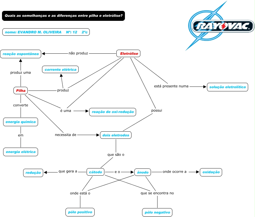 Esse mapa conceitual, produzido no IHMC CmapTools, tem a informação relacionada a: Pilhas e eletrólise 2, Eletrólise não produz reação espontânea, Eletrólise produz corrente elétrica, Eletrólise possui dois eletrodos, cátodo que se encontra no pólo negativo, Eletrólise está presente numa solução eletrolítica, ânodo que se encontra no pólo negativo, Pilha produz corrente elétrica, cátodo onde está o pólo positivo, ânodo onde está o pólo positivo, Pilha necessita de dois eletrodos, cátodo e o ânodo, dois eletrodos que são o cátodo, Eletrólise é uma reação de oxi-redução, ânodo onde ocorre a oxidação, energia química em energia elétrica, Pilha produz uma reação espontânea, Pilha é uma reação de oxi-redução, cátodo que gera a redução, Pilha converte energia química
