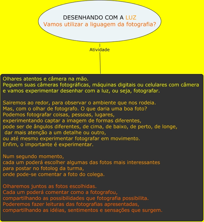 Esse mapa conceitual, produzido no IHMC CmapTools, tem a informação relacionada a: desenhando com a luz, DESENHANDO COM A LUZ Vamos utilizar a liguagem da fotografia? Atividade Olhares atentos e câmera na mão. Peguem suas câmeras fotográficas, máquinas digitais ou celulares com câmera e vamos experimentar desenhar com a luz, ou seja, fotografar. Sairemos ao redor, para observar o ambiente que nos rodeia. Mas, com o olhar de fotografo. O que daria uma boa foto? Podemos fotografar coisas, pessoas, lugares, experimentando captar a imagem de formas diferentes, pode ser de ângulos diferentes, de cima, de baixo, de perto, de longe, dar mais atenção a um detalhe ou outro, ou até mesmo experimentar fotografar em movimento. Enfim, o importante é experimentar. Num segundo momento, cada um poderá escolher algumas das fotos mais interessantes para postar no fotolog da turma, onde pode-se comentar a foto do colega. Olharemos juntos as fotos escolhidas. Cada um poderá comentar como a fotografou, compartilhando as possibilidades que fotografia possibilita. Poderemos fazer leituras das fotografias apresentadas, compartilhando as idéias, sentimentos e sensações que surgem.