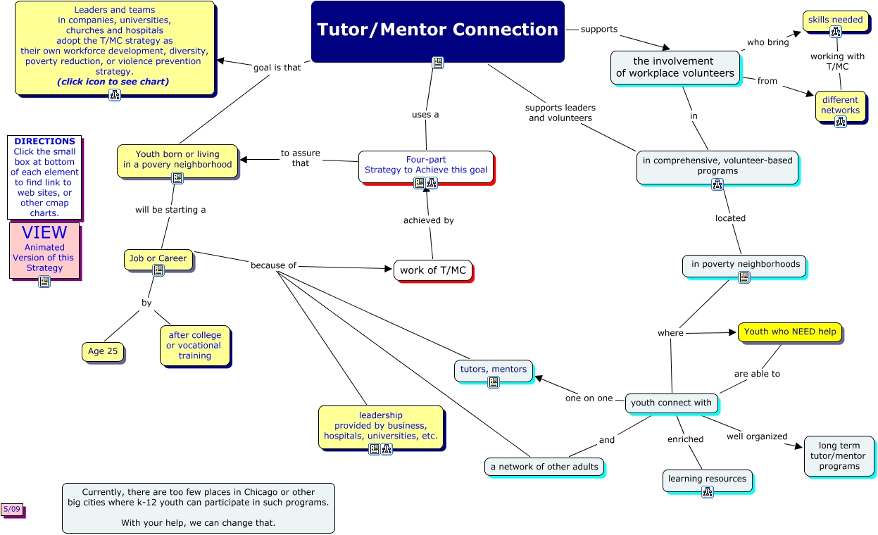 This Concept Map has information related to: TMC, the involvement of workplace volunteers who bring skills needed, Tutor/Mentor Connection goal is that Youth born or living in a povery neighborhood, a network of other adults because of work of T/MC, Tutor/Mentor Connection supports leaders and volunteers in comprehensive, volunteer-based programs, tutors, mentors because of leadership provided by business, hospitals, universities, etc., the involvement of workplace volunteers in in comprehensive, volunteer-based programs, Job or Career by Age 25, youth connect with and a network of other adults, in comprehensive, volunteer-based programs located in poverty neighborhoods, youth connect with well organized long term tutor/mentor programs