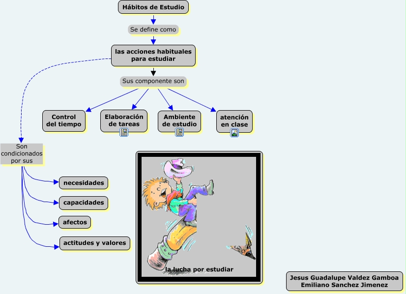 Este Cmap, tiene información relacionada con: Hábito de estudio, las acciones habituales para estudiar Sus componente son atención en clase, las acciones habituales para estudiar Son condicionados por sus capacidades, las acciones habituales para estudiar Sus componente son Control del tiempo, Hábitos de Estudio Se define como las acciones habituales para estudiar, las acciones habituales para estudiar Sus componente son Ambiente de estudio, las acciones habituales para estudiar Son condicionados por sus actitudes y valores, las acciones habituales para estudiar Son condicionados por sus afectos, las acciones habituales para estudiar Son condicionados por sus necesidades, las acciones habituales para estudiar Sus componente son Elaboración de tareas