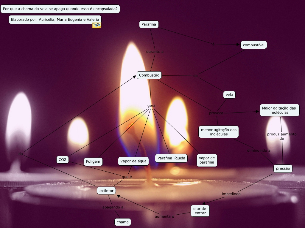 This Concept Map, created with IHMC CmapTools, has information related to: VELA MARIA EUGENIA E VALÉRIA, Combustão provoca Maior agitação das moléculas, CO2 que é extintor, extintor da Combustão, Vapor de água que é extintor, Combustão gera Fuligem, Combustão gera Parafina líquida, menor agitação das moléculas diminuindo a pressão, Combustão da vela, Combustão provoca menor agitação das moléculas, Parafina durante a Combustão, pressão impedindo o ar de entrar, Combustão gera Vapor de água, o ar de entrar aumenta o extintor, Combustão gera CO2, vela provoca Maior agitação das moléculas, Maior agitação das moléculas produz aumento de pressão, extintor apagando a chama, combustível da vela, Combustão gera vapor de parafina, vela provoca menor agitação das moléculas