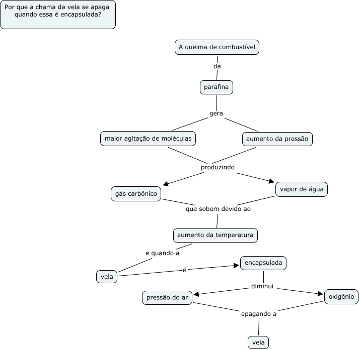 Esse mapa conceitual, produzido no IHMC CmapTools, tem a informação relacionada a: Caclefe, maior agitação de moléculas produzindo gás carbônico, parafina gera maior agitação de moléculas, encapsulada diminui oxigênio, vela é encapsulada, oxigênio apagando a vela, pressão do ar apagando a vela, A queima de combustível da parafina, vapor de água que sobem devido ao aumento da temperatura, gás carbônico que sobem devido ao aumento da temperatura, maior agitação de moléculas produzindo vapor de água, aumento da pressão produzindo gás carbônico, parafina gera aumento da pressão, aumento da pressão produzindo vapor de água, aumento da temperatura e quando a vela, encapsulada diminui pressão do ar