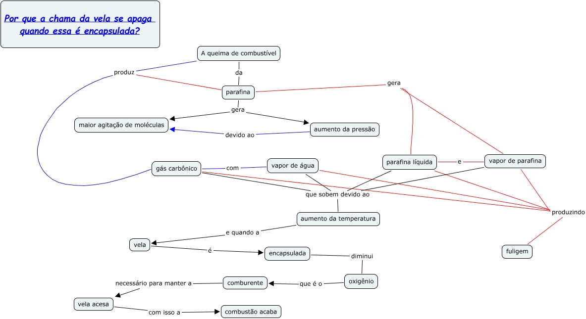 Esse mapa conceitual, produzido no IHMC CmapTools, tem a informação relacionada a: Cleide, Carmen e Fernanda, gás carbônico que sobem devido ao aumento da temperatura, A queima de combustível da parafina, oxigênio que é o comburente, A queima de combustível produz gás carbônico, vapor de água que sobem devido ao aumento da temperatura, parafina líquida produzindo fuligem, parafina gera aumento da pressão, parafina gera parafina líquida, vela acesa com isso a combustão acaba, parafina líquida que sobem devido ao aumento da temperatura, parafina gera maior agitação de moléculas, parafina produz gás carbônico, aumento da temperatura e quando a vela, vapor de parafina que sobem devido ao aumento da temperatura, vapor de parafina produzindo fuligem, encapsulada diminui oxigênio, vapor de água produzindo fuligem, comburente necessário para manter a vela acesa, gás carbônico produzindo fuligem, parafina gera vapor de parafina