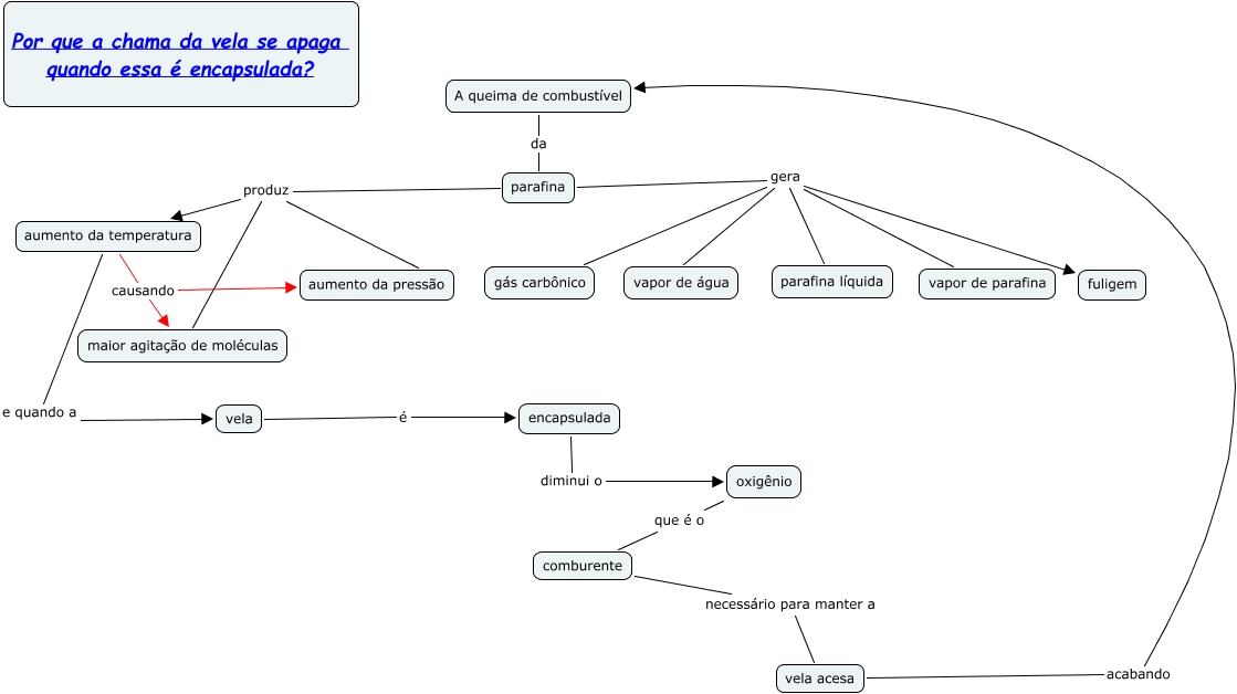 Esse mapa conceitual, produzido no IHMC CmapTools, tem a informação relacionada a: Carmen, Cleide e Fernanda, encapsulada diminui o oxigênio, parafina produz aumento da temperatura, comburente necessário para manter a vela acesa, aumento da temperatura causando aumento da pressão, vela é encapsulada, parafina gera vapor de água, parafina gera parafina líquida, parafina produz maior agitação de moléculas, parafina gera vapor de parafina, oxigênio que é o comburente, vela acesa acabando A queima de combustível, parafina gera gás carbônico, aumento da temperatura e quando a vela, A queima de combustível da parafina, parafina gera fuligem, parafina produz aumento da pressão, aumento da temperatura causando maior agitação de moléculas
