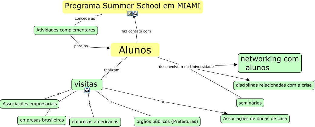 Esse mapa conceitual, produzido no IHMC CmapTools, tem a informação relacionada a: Projeto do Summer School, Alunos realizam visitas, Atividades complementares para os Alunos, Programa Summer School em MIAMI concede as Atividades complementares, Alunos desenvolvem na Universidade seminários, visitas a empresas americanas, visitas a empresas brasileiras, visitas a Associações de donas de casa, visitas a Associações empresariais, Alunos desenvolvem na Universidade disciplinas relacionadas com a crise, Alunos desenvolvem na Universidade networking com alunos, Alunos faz contato com Programa Summer School em MIAMI, visitas a orgãos públicos (Prefeituras)