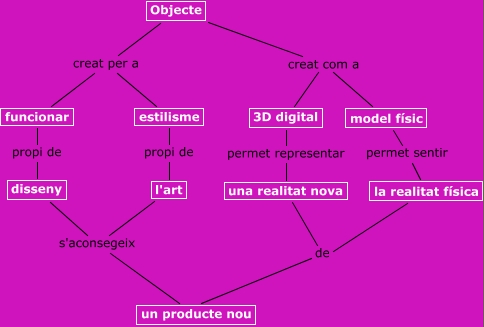 This Concept Map, created with IHMC CmapTools, has information related to: Producte, una realitat nova de un producte nou, estilisme propi de l'art, model físic permet sentir la realitat física, 3D digital permet representar una realitat nova, Objecte creat com a 3D digital, la realitat física de un producte nou, funcionar propi de disseny, Objecte creat com a model físic, Objecte creat per a funcionar, disseny s'aconsegeix un producte nou, l'art s'aconsegeix un producte nou, Objecte creat per a estilisme