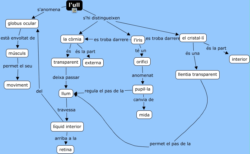 This Concept Map, created with IHMC CmapTools, has information related to: l'ull, l'ull s'hi distingueixen la còrnia, el cristal·lí es troba darrere l'iris, orifici anomenat pupil·la, la còrnia és transparent, l'ull s'anomena globus ocular, pupil·la regula el pas de la llum, la còrnia és la part externa, músculs permet el seu moviment, el cristal·lí és la part interior, líquid interior arriba a la retina, pupil·la canvia de mida, llentia transparent permet el pas de la llum, l'iris té un orifici, el cristal·lí és una llentia transparent, l'ull s'hi distingueixen l'iris, líquid interior del globus ocular, llum travessa líquid interior, globus ocular està envoltat de músculs, transparent deixa passar llum, l'iris es troba darrere la còrnia