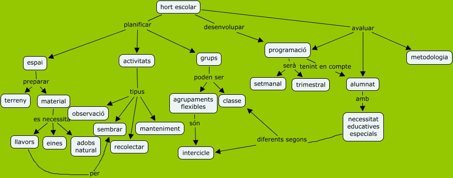 This Concept Map, created with IHMC CmapTools, has information related to: hort escolar, alumnat amb necessitat educatives especials, espai preparar terreny, hort escolar desenvolupar programació, agrupaments flexibles són intercicle, activitats tipus manteniment, hort escolar avaluar alumnat, activitats tipus recolectar, material es necessita eines, hort escolar planificar grups, programació tenint en compte alumnat, hort escolar avaluar metodologia, grups poden ser classe, material es necessita adobs natural, hort escolar avaluar programació, activitats tipus observació, hort escolar planificar espai, grups poden ser agrupaments flexibles, hort escolar planificar activitats, programació serà setmanal, programació serà trimestral