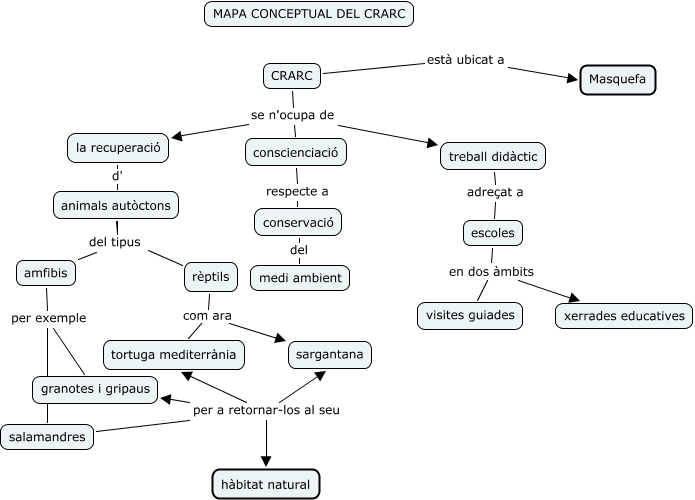 This Concept Map, created with IHMC CmapTools, has information related to: CRARC, conservació del medi ambient, animals autòctons del tipus amfibis, la recuperació d' animals autòctons, salamandres per a retornar-los al seu hàbitat natural, CRARC se n'ocupa de treball didàctic, salamandres per a retornar-los al seu sargantana, rèptils com ara sargantana, treball didàctic adreçat a escoles, rèptils del tipus amfibis, CRARC se n'ocupa de conscienciació, salamandres per a retornar-los al seu granotes i gripaus, escoles en dos àmbits xerrades educatives, CRARC se n'ocupa de la recuperació, amfibis per exemple granotes i gripaus, animals autòctons del tipus amfibis, salamandres per a retornar-los al seu tortuga mediterrània, CRARC està ubicat a Masquefa, amfibis per exemple salamandres, rèptils com ara tortuga mediterrània, conscienciació respecte a conservació