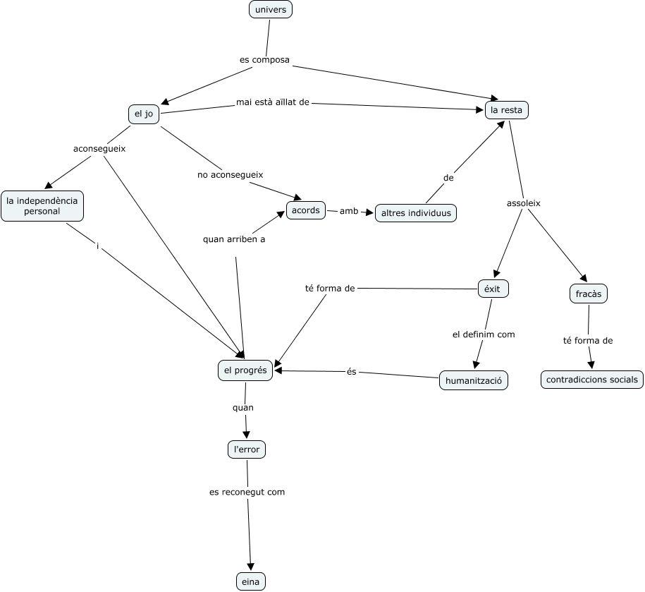 This Concept Map, created with IHMC CmapTools, has information related to: Copy of jordi, acords amb altres individuus, el progrés quan l'error, univers es composa la resta, fracàs té forma de contradiccions socials, el jo aconsegueix la independència personal, éxit té forma de el progrés, univers es composa el jo, el jo mai està aïllat de la resta, la independència personal i el progrés, la resta assoleix éxit, humanització és el progrés, altres individuus de la resta, el progrés quan arriben a acords, el jo no aconsegueix acords, la resta assoleix fracàs, el jo aconsegueix el progrés, l'error es reconegut com eina, éxit el definim com humanització