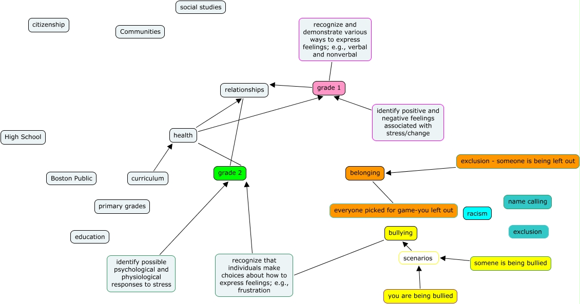 This Concept Map has information related to: Dale W's map, belonging everyone picked for game-you left out, grade 1 relationships, curriculum health, health grade 1, health grade 2, exclusion - someone is being left out belonging, relationships grade 2, health relationships, you are being bullied scenarios, recognize and demonstrate various ways to express feelings; e.g., verbal and nonverbal grade 1