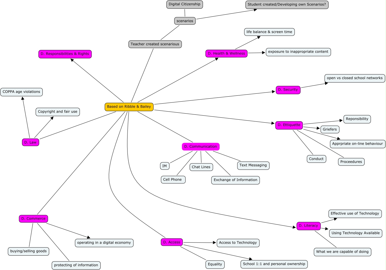 This Concept Map, created with IHMC CmapTools, has information related to: Carmen, Jay, Linc & Sheldon, D. Communication IM, Based on Ribble & Bailey D. Security, D. Ettiquette Griefers, D. Access School 1:1 and personal ownership, D. Literacy Effective use of Technology, D. Health & Wellness exposure to inappropriate content, Digital Citizenship scenarios, Based on Ribble & Bailey D. Ettiquette, D. Ettiquette Apprpriate on-line behaviour, D. Health & Wellness life balance & screen time, D. Communication Exchange of Information, Based on Ribble & Bailey D. Law, D. Access Equality, D. Access Access to Technology, D. Commerce buying/selling goods, D. Law COPPA age violations, D. Communication Chat Lines, D. Security open vs closed school networks, D. Ettiquette Reponsibility, D. Communication Text Messaging