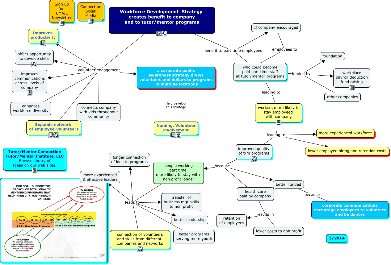 This Concept Map, created with IHMC CmapTools, has information related to: workforce development company, workers more likely to stay employeed with company leading to lower employee hiring and retention costs, who could become paid part time staff at tutor/mentor programs leading to workers more likely to stay employeed with company, who could become paid part time staff at tutor/mentor programs funded by foundation, Workforce Development Strategy creates benefit to company and to tutor/mentor programs volunteer engagement enhances workforce diversity, Workforce Development Strategy creates benefit to company and to tutor/mentor programs volunteer engagement connects company with kids throughout community, people working part time more likely to stay with non profit longer leads to connection of volunteers and skills from different companies and networks, Workforce Development Strategy creates benefit to company and to tutor/mentor programs volunteer engagement improves communications across levels of company, Workforce Development Strategy creates benefit to company and to tutor/mentor programs volunteer engagement Improves productivity, workers more likely to stay employeed with company leading to more experienced workforce, a corporate public awareness strategy draws volunteers and dollars to programs in multiple locations Help develop this strategy Naming. Volunteer Involvement., people working part time more likely to stay with non profit longer leads to transfer of business mgt skills to non profit, Workforce Development Strategy creates benefit to company and to tutor/mentor programs benefit to part time employees If company encouraged, people working part time more likely to stay with non profit longer leads to better programs serving more youth, Workforce Development Strategy creates benefit to company and to tutor/mentor programs volunteer engagement offers opportunity to develop skills, health care paid by company results in retention of employees, workers more likely to stay employeed with company leading to improved quality of t/m programs, improved quality of t/m programs because better funded, better funded because corporate communications encourage employees to volunteer and be donors, health care paid by company results in lower costs to non profit, who could become paid part time staff at tutor/mentor programs funded by other companies