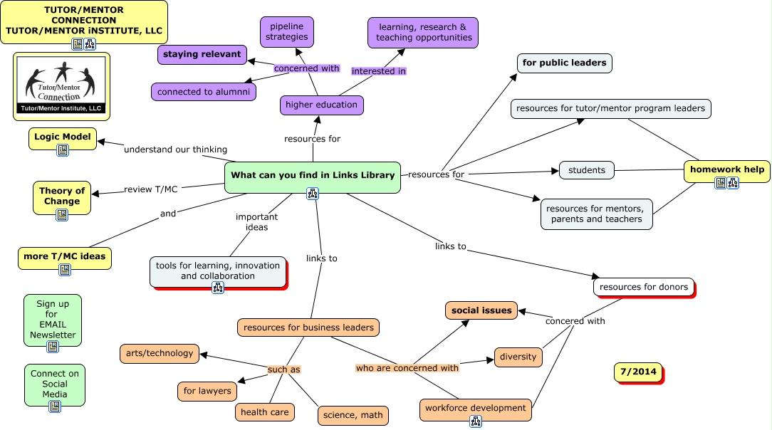This Concept Map, created with IHMC CmapTools, has information related to: guide for links library users, What can you find in Links Library resources for resources for tutor/mentor program leaders, What can you find in Links Library links to resources for donors, resources for business leaders who are concerned with workforce development, What can you find in Links Library and more T/MC ideas, resources for donors concered with diversity, resources for business leaders such as health care, resources for business leaders such as arts/technology, homework help ???? resources for tutor/mentor program leaders, What can you find in Links Library review T/MC Theory of Change, What can you find in Links Library understand our thinking Logic Model, What can you find in Links Library resources for for public leaders, resources for donors concered with workforce development, resources for donors concered with social issues, homework help ???? students, resources for business leaders such as for lawyers, higher education concerned with connected to alumnni, What can you find in Links Library resources for students, homework help ???? resources for mentors, parents and teachers, resources for business leaders who are concerned with diversity, resources for business leaders such as science, math