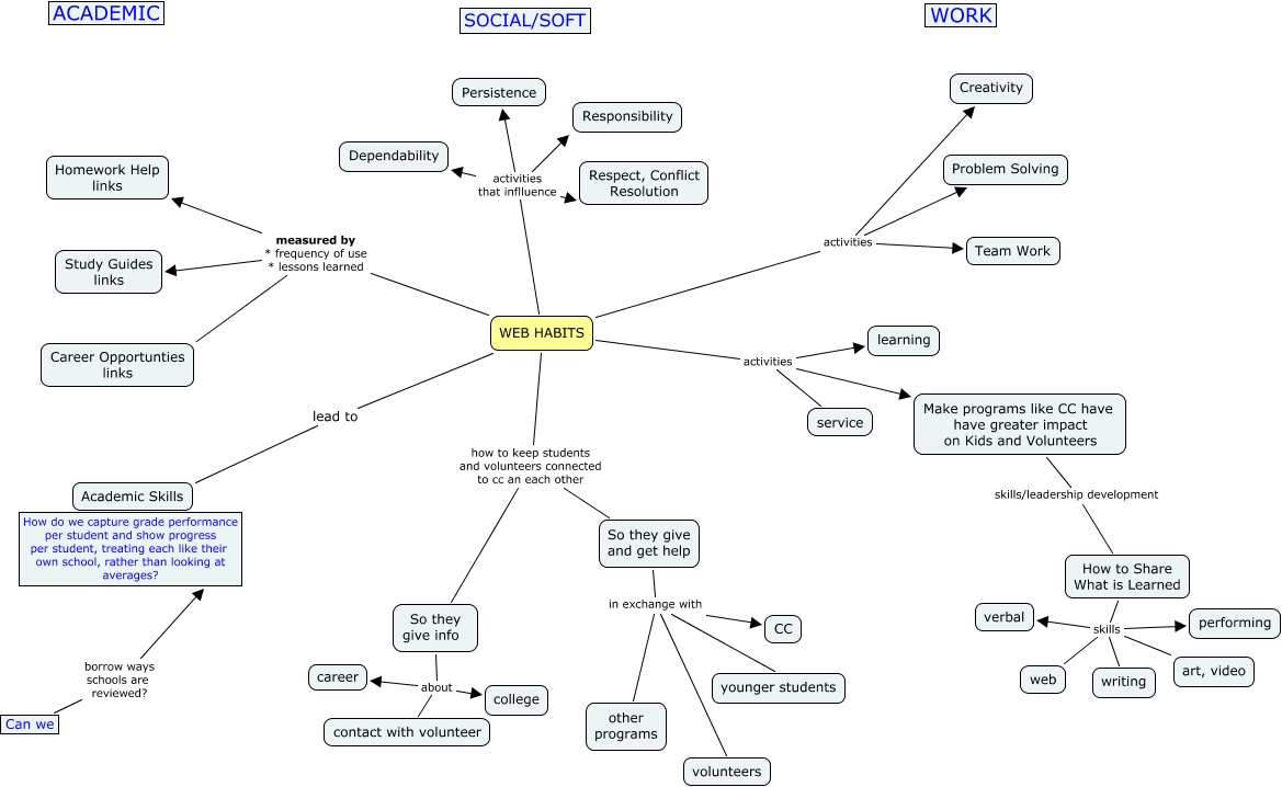 This Concept Map has information related to: CC Learning Goals, WEB HABITS activities learning, How to Share What is Learned skills web, WEB HABITS measured by * frequency of use * lessons learned Homework Help links, WEB HABITS lead to Academic Skills, So they give info about contact with volunteer, So they give info about college, Can we borrow ways schools are reviewed? How do we capture grade performance per student and show progress per student, treating each like their own school, rather than looking at averages?, How to Share What is Learned skills writing, So they give and get help in exchange with younger students, So they give and get help in exchange with other programs