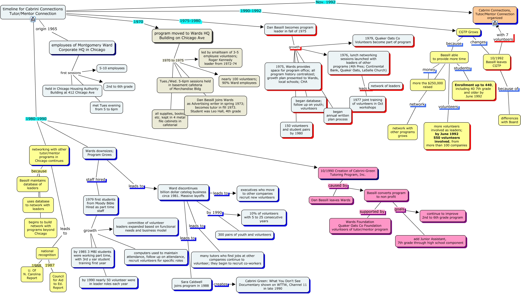 This Concept Map has information related to: timeline 1965 to 1992, employees of Montgomery Ward Corporate HQ in Chicago first sessions 2nd to 6th grade, 10/1992 Bassill leaves CGTP with 7 volunteers Cabrini Connections, Tutor/Mentor Connection organized, 10/1990 Creation of Cabrini-Green Tutoring Program, Inc. caused by Bassill converts program to non profit, program moved to Wards HQ Building on Chicago Ave 1970 to 1975 Tues./Wed. 5-6pm sessions held in basement cafeteria of Merchandise Bldg, Dan Bassill becomes program leader in fall of 1975 growth 1976, lunch networking sessions launched with leaders of other programs (4th Pres; Continental Bank, Quaker Oats, LaSalle Church), employees of Montgomery Ward Corporate HQ in Chicago first sessions held in Chicago Housing Authority Building at 412 Chicago Ave, 1979 first students from Moody Bible Hired as part time staff growth by 1985 3 MBI students were working part time, with 3rd y ear student training first year, timeline for Cabrini Connections Tutor/Mentor Connection 1980-1990 10/1990 Creation of Cabrini-Green Tutoring Program, Inc., Wards downsizes; Program Grows leads to Ward discontinues billion dollar catelog business circa 1981. Massive layoffs, Bassill converts program to non profit goals continue to improve 2nd to 6th grade program