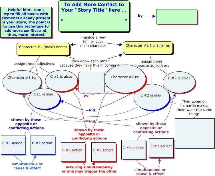 This Concept Map has information related to: 355_More_Conflict, Character #1 (main) name: they know each other because they have this in common: Character #2 (foil) name:, Character #1 (main) name: assign three adjectives: Character #1 is:, Character #2 (foil) name: assign three opposite adjectives: C #2 is also:, C #2 is also: v.s. C#1 is also:, To Add More Conflict to Your "Story Title" here . . " " imagine a new foil for your main character Character #1 (main) name:, Character #2 (foil) name: assign three opposite adjectives: Character #2 is:, C #1 action: occuring simultaneously or one may trigger the other C #2 action:, Character #2 is: vs C #1 is also:, Character #1 (main) name: they know each other because they have this in common: , C #2 is also: shown by these opposite or conflicting actions C #1 action: