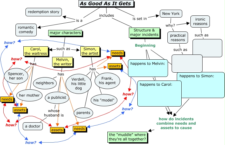 This Concept Map has information related to: As Good As it Gets, Carol, the waitress has her mother, Melvin, the writer has needs, needs how? assets, New York why? ironic reasons, needs how? assets, assets how? needs, Melvin, the writer has a publicist, practical reasons such as , New York why? practical reasons, Structure & major incidents Beginning happens to Melvin: