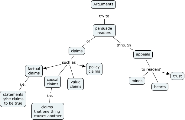This Concept Map has information related to: cmapstart, claims such as value claims, Arguments try to persuade readers, claims such as factual claims, factual claims i.e. statements s/he claims to be true, persuade readers through appeals, appeals to readers' hearts, causal claims i.e. claims that one thing causes another, appeals to readers' trust, claims such as causal claims, appeals to readers' minds