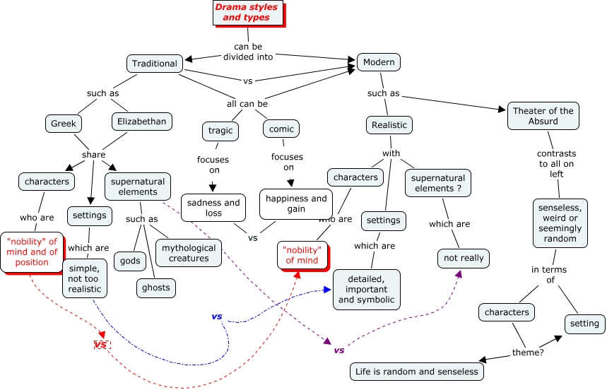 This Concept Map has information related to: Drama, Greek share Elizabethan, Modern such as Theater of the Absurd, supernatural elements ? which are not really, tragic focuses on sadness and loss, Realistic with characters, Traditional vs Modern, Greek share supernatural elements, Traditional such as Elizabethan, supernatural elements vs not really, supernatural elements such as mythological creatures