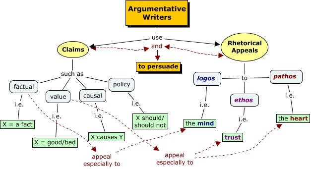 This Concept Map, created with IHMC CmapTools, has information related to: 122ArgIntro, ethos i.e. trust, value appeal especially to the heart, Claims and to persuade, pathos i.e. the heart, Argumentative Writers use Rhetorical Appeals, Argumentative Writers use Claims, causal i.e. X causes Y, Rhetorical Appeals to ethos, policy i.e. X should/ should not, Rhetorical Appeals to logos, value i.e. X = good/bad, factual appeal especially to the mind, Claims and Rhetorical Appeals, Claims such as policy, Claims such as value, logos i.e. the mind, value appeal especially to trust, Claims such as factual, Rhetorical Appeals to pathos, Claims such as causal