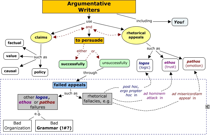 This Concept Map, created with IHMC CmapTools, has information related to: 122ArgIntro2, failed appeals such as other logos, ethos or pathos failures, rhetorical fallacies, e.g. ad misericordiam appeal in pathos (emotion), unsuccessfully through failed appeals, rhetorical appeals such as ethos (trust), Argumentative Writers including You!, rhetorical fallacies, e.g. post hoc, ergo propter hoc in logos (logic), claims such as causal, to persuade either successfully, rhetorical appeals such as logos (logic), Argumentative Writers use claims, rhetorical fallacies, e.g. ad hominem attack in ethos (trust), claims such as factual, other logos, ethos or pathos failures e.g. Bad Grammar (!#?), claims such as policy, other logos, ethos or pathos failures e.g. Bad Organization, successfully or unsuccessfully, Argumentative Writers use rhetorical appeals, rhetorical appeals such as pathos (emotion), claims such as value, failed appeals such as rhetorical fallacies, e.g.