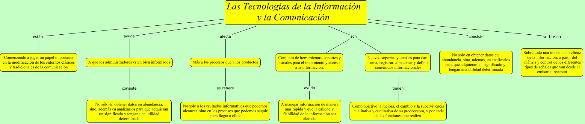 Este Cmap, tiene información relacionada con: Las Tecnologías de la Información y la Comunicación, A que los administradores estén bien informados consiste No sólo en obtener datos en abundancia, sino, además en analizarlos para que adquieran un significado y tengan una utilidad determinada, Las Tecnologías de la Información y la Comunicación están Comenzando a jugar un papel importante en la modificación de los entornos clásicos y tradicionales de la comunicación, Las Tecnologías de la Información y la Comunicación consiste No sólo en obtener datos en abundancia, sino, además, en analizarlos para que adquieran un significado y tengan una utilidad determinada, Las Tecnologías de la Información y la Comunicación se busca Sobre todo una transmisión eficaz de la información, a partir del análisis y control de los diferentes tipos de señales que van desde el emisor al receptor, Las Tecnologías de la Información y la Comunicación son Conjunto de herramientas, soportes y canales para el tratamiento y acceso a la información., Las Tecnologías de la Información y la Comunicación ayuda A que los administradores estén bien informados, Nuevos soportes y canales para dar forma, registrar, almacenar y definir contenidos informacionales tienen Como objetivo la mejora, el cambio y la supervivencia cualitativa y cuntitativa de su predecesora, y por ende de las funciones que realiza., Las Tecnologías de la Información y la Comunicación afecta Más a los procesos que a los productos, Las Tecnologías de la Información y la Comunicación son Nuevos soportes y canales para dar forma, registrar, almacenar y definir contenidos informacionales, Conjunto de herramientas, soportes y canales para el tratamiento y acceso a la información. ayuda A manejar información de manera más rápida y que la calidad y fiabilidad de la información sea elevada., Más a los procesos que a los productos se refiere No sólo a los esultados informativos que podemos alcanzar, sino en los procesos que podemos seguir para llegar a ellos.