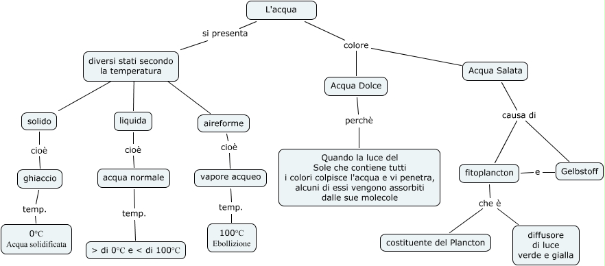 Questa Cmap, creata con IHMC CmapTools, contiene informazioni relative a: Al suo barbiere.. - Cap. 6- L'acqua, Acqua Dolce perchè Quando la luce del Sole che contiene tutti i colori colpisce l'acqua e vi penetra, alcuni di essi vengono assorbiti dalle sue molecole, fitoplancton che è costituente del Plancton, diversi stati secondo la temperatura ???? aireforme, diversi stati secondo la temperatura ???? solido, aireforme cioè vapore acqueo, solido cioè ghiaccio, acqua normale temp. > di 0°C e < di 100°C, Acqua Salata causa di Gelbstoff, vapore acqueo temp. 100°C Ebollizione, diversi stati secondo la temperatura ???? liquida, Acqua Salata causa di fitoplancton, fitoplancton che è diffusore di luce verde e gialla, L'acqua colore Acqua Salata, L'acqua colore Acqua Dolce, fitoplancton e Gelbstoff, liquida cioè acqua normale, L'acqua si presenta diversi stati secondo la temperatura, ghiaccio temp. 0°C Acqua solidificata