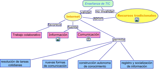 Este mapa conceptual tiene información relacionada a: Silvina- Stelli- Cheche-, Enseñanza de TIC no invalidar Recursos tradicionales, Internet fuente Información, Internet permite construcción autonoma de conocimiento, Enseñanza de TIC validar Internet, Internet permite resolución de tareas cotidianas, Internet apoyo Recursos tradicionales, Internet permite registro y socialización de información, Internet fuente Comunicación, Internet favorece Trabajo colaborativo, Internet permite nuevas formas de comunicación
