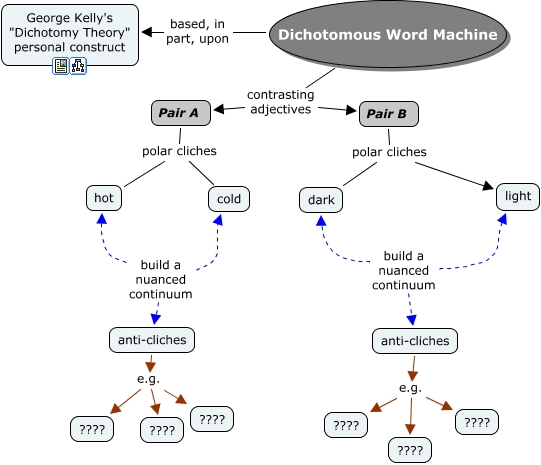 This Concept Map, created with IHMC CmapTools, has information related to: KellyDichCharWord, anti-cliches e.g. ????, Dichotomous Word Machine based, in part, upon George Kelly's "Dichotomy Theory" personal construct, Pair A polar cliches hot, Pair B polar cliches light, anti-cliches e.g. ????, anti-cliches e.g. ????, anti-cliches e.g. ????, anti-cliches e.g. ????, Dichotomous Word Machine contrasting adjectives Pair A, Dichotomous Word Machine contrasting adjectives Pair B, anti-cliches e.g. ????, Pair B polar cliches dark, Pair A polar cliches cold